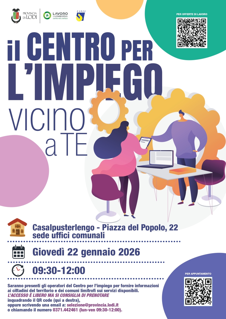 Gli operatori del Centro per l'impiego saranno presso il municipio di Casalpusterlengo