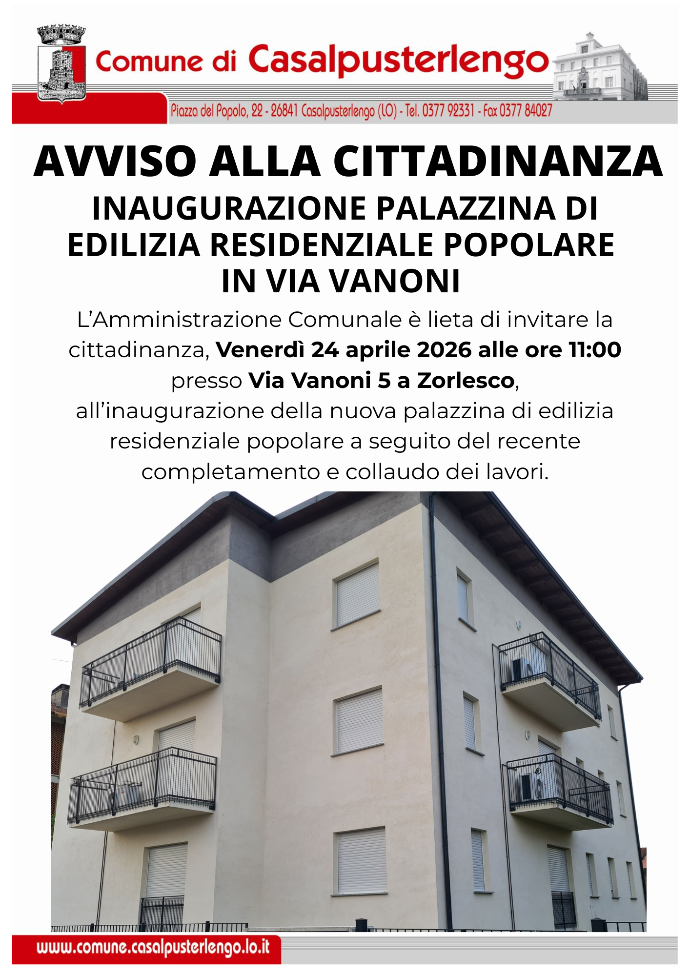 L'Amministrazione Comunale è lieta di invitare la cittadinanza venerdì 24 aprile 2026 alle ore 11:00 presso Via Vanoni 5 a Zorlesco, all'inaugurazione della nuova palazzina di edilizia residenziale popolare a seguito del recente completamento e collaudo dei lavori.